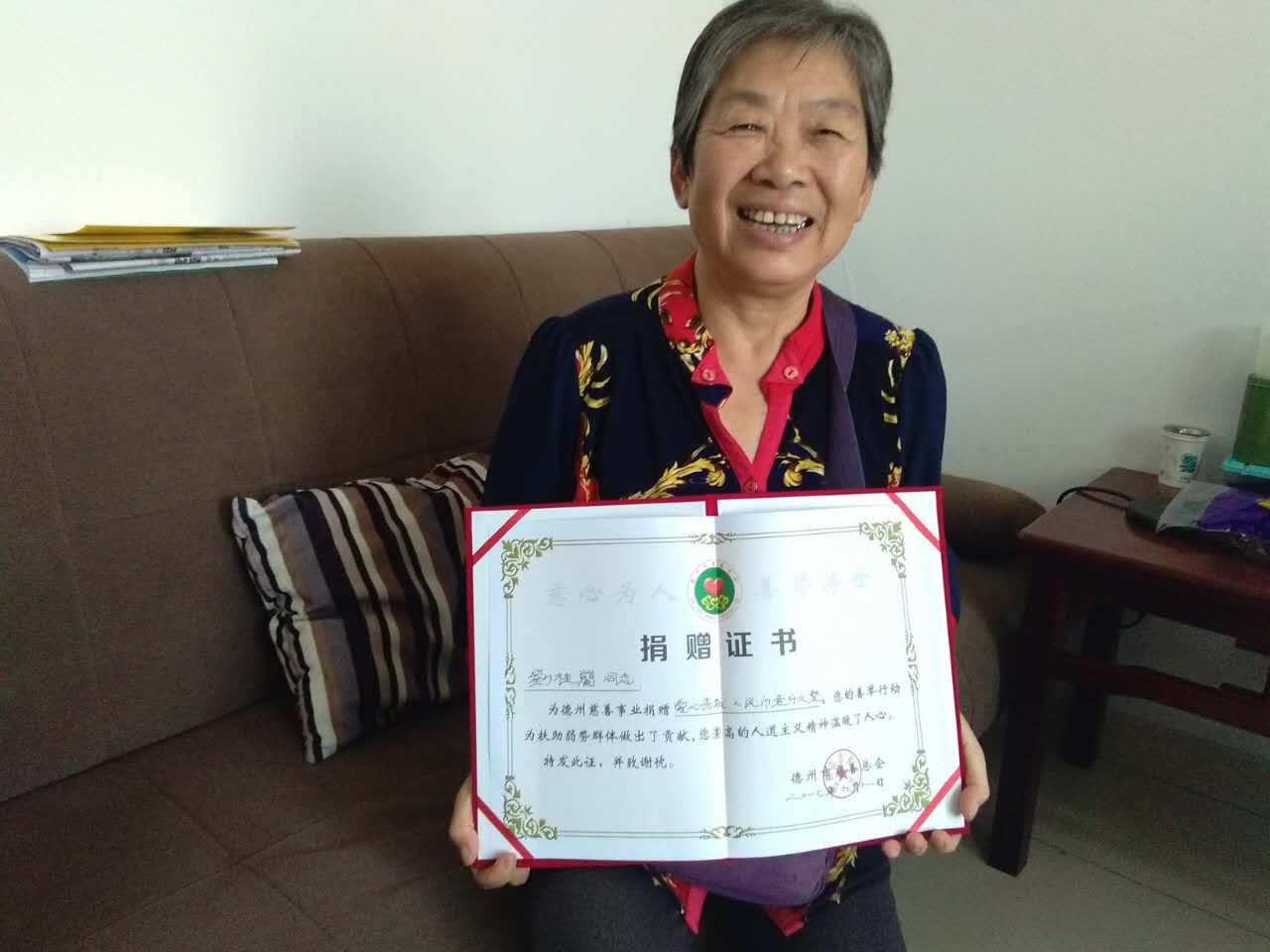 9月12日,67岁的刘桂兰大娘来到德州市慈善总会,捐赠了1000元钱了却了多年的慈善心愿。她说:“俺能有今天的好日子,多亏了党和国家,钱虽然不多,但能为社会做点贡献,挺好的”。据悉,刘大娘的家庭经济条件并不太好,每月仅靠170多元的补助和500多元的抚恤金度日,当知晓“慈心一日捐”的活动开始后,便把自己近几个月省吃俭用积攒的1000元钱进行了捐赠。市慈善总会为刘大娘开具了捐赠票据并颁发了爱心捐赠证书。